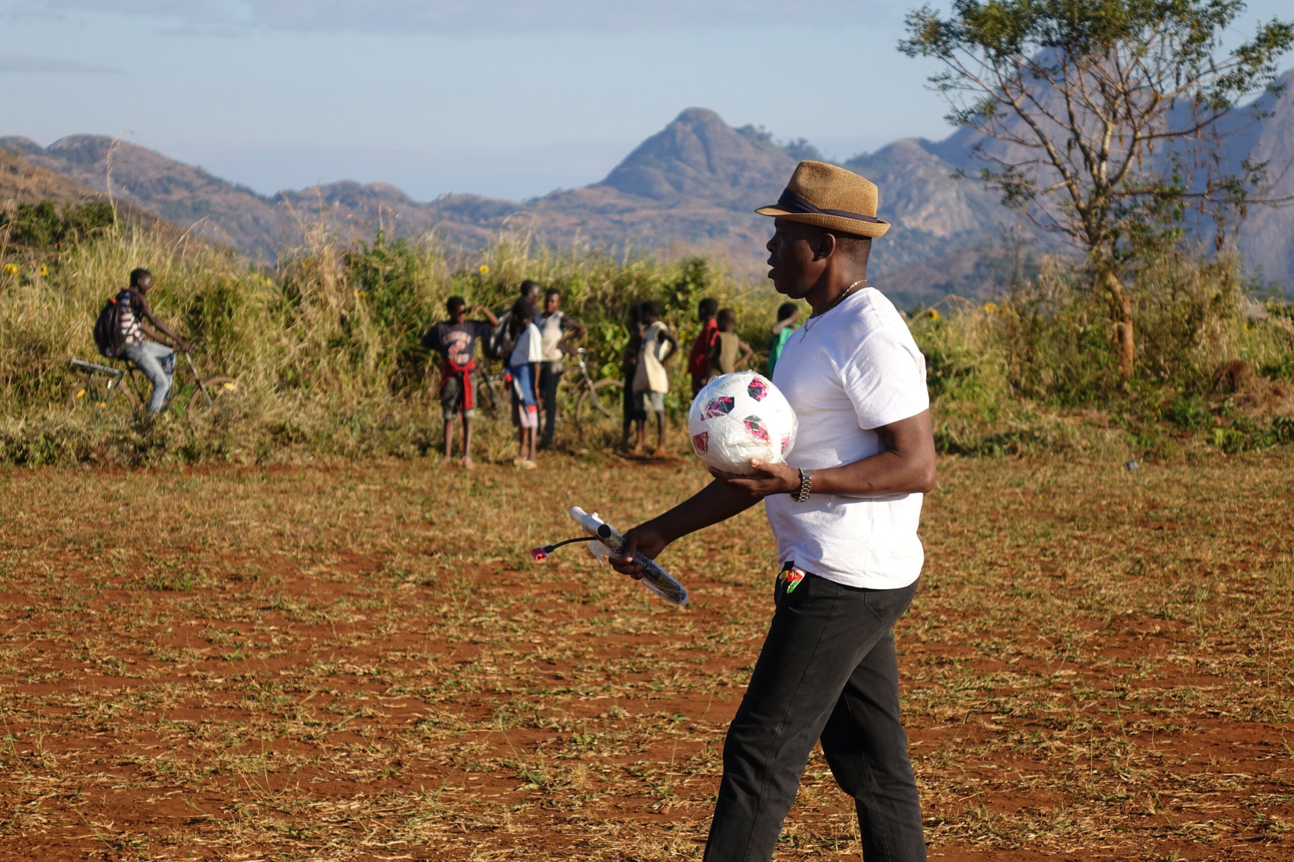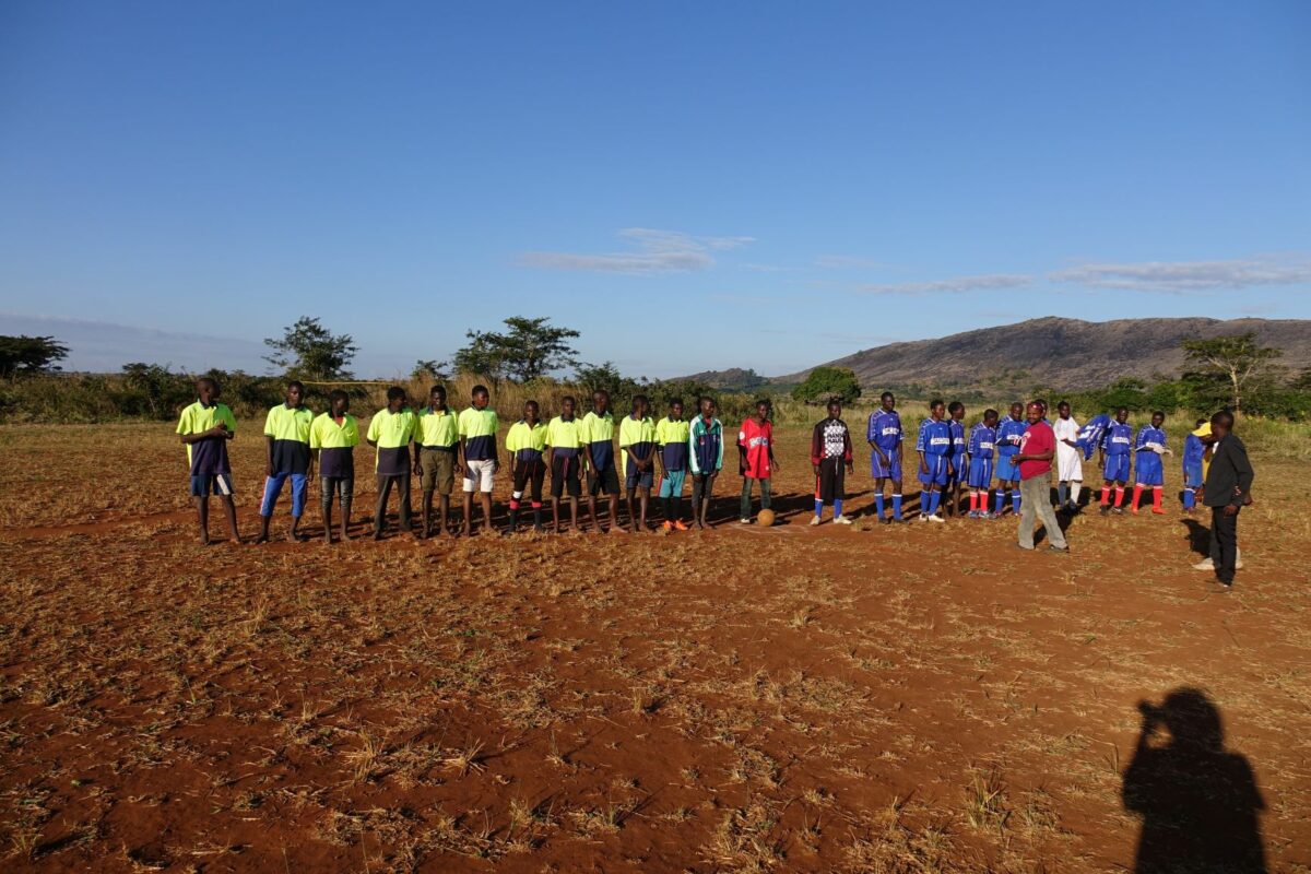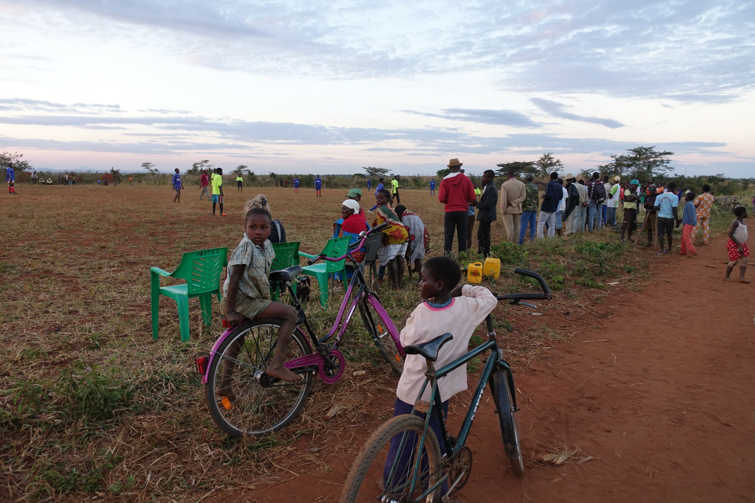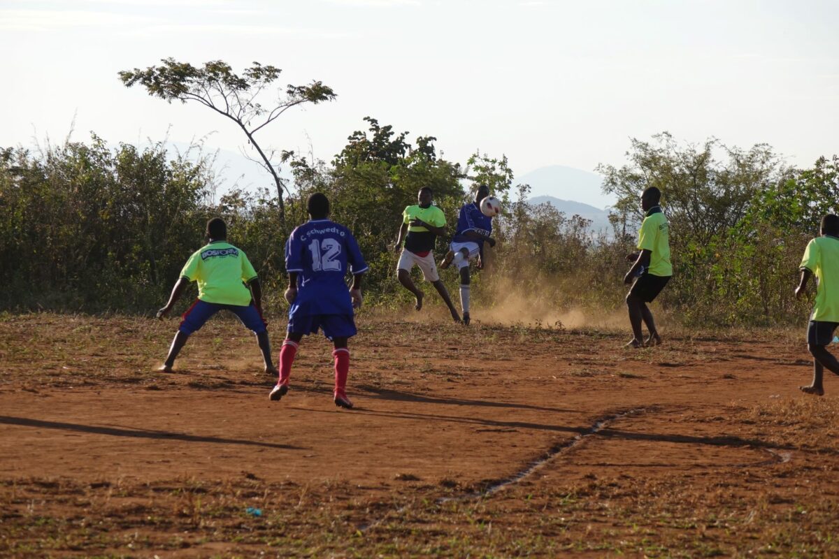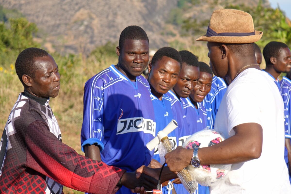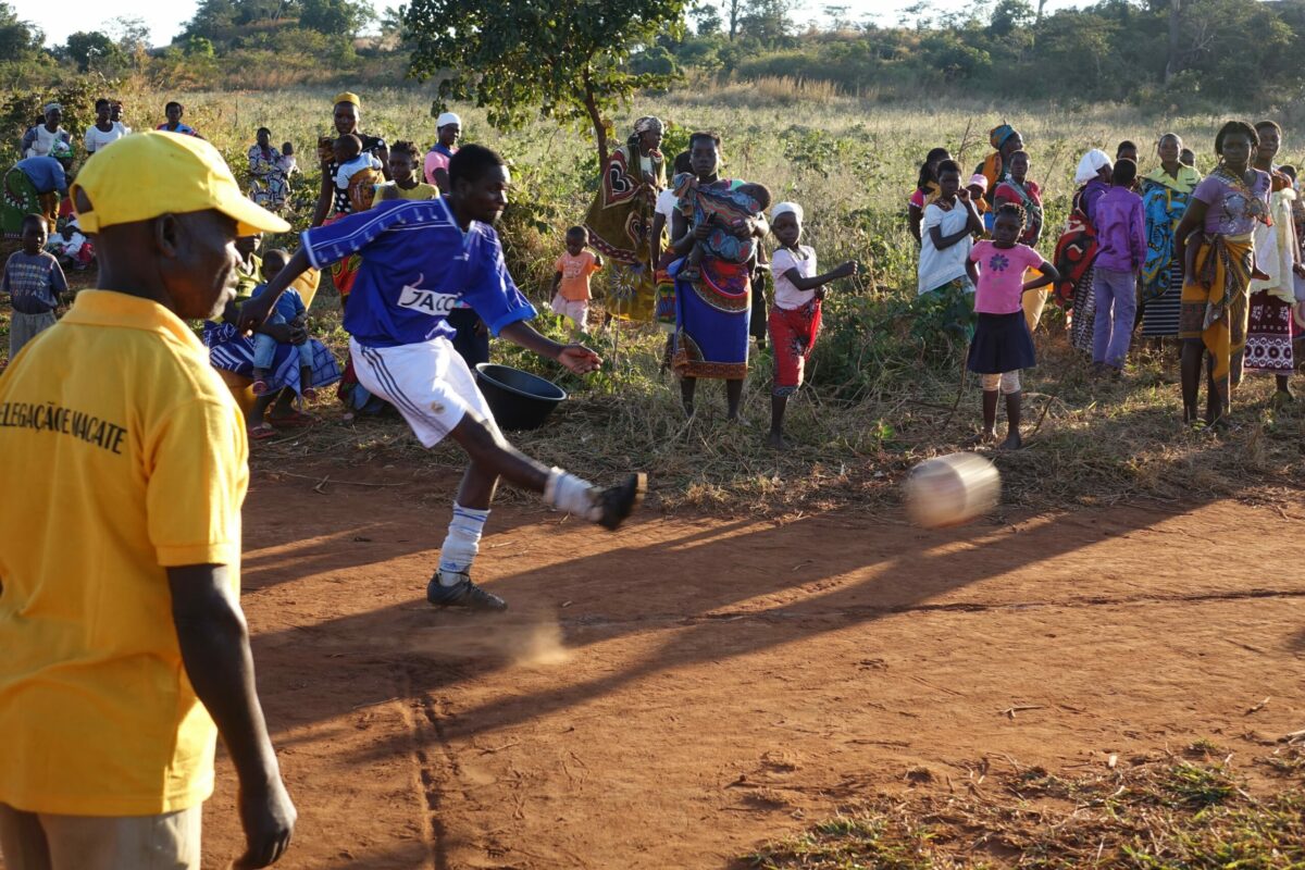 An einem Sonntagnachmittag im September 2018 versammelt sich die ganze Gemeinde rund um den Fußballplatz in Charonga. Das Team „Charonga“ erwartet die Mannschaft aus der Nachbargemeinde Nhamassacara zum Freundschaftsspiel. Wir sind aus Deutschland zu Besuch, Ibraimo hat Trikots und einen neuen Ball mitgebracht. Vor dem Spiel erfolgt die feierliche Übergabe des Balls und auch des Dankeschöngeschenks in der Tradition der Gastgeber. Obwohl einige Spieler der Gegner schlechter ausgestattet sind und barfuß spielen, gewinnen sie am Ende 1:0.